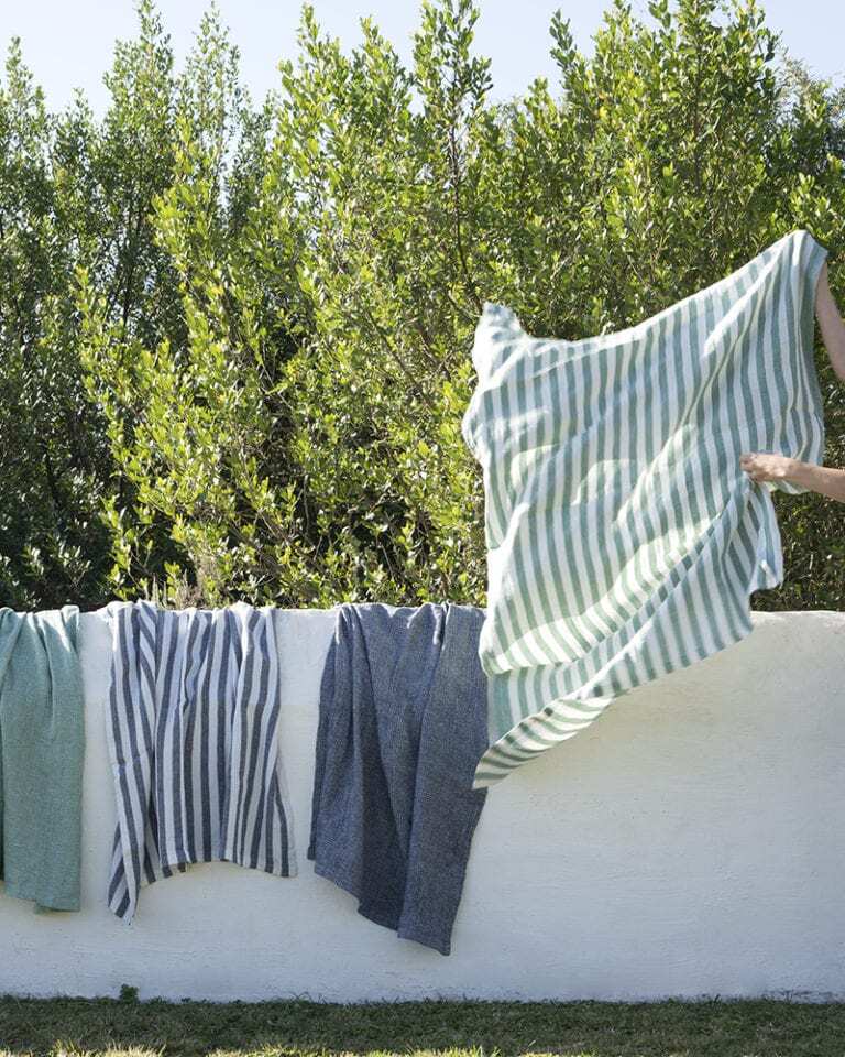 Mungoブランドが得意とする平織りの100%リネンのタオルで、ダウ船(Dhow:アラビア海・インド洋で活躍した伝統的な帆船で、主に中東アジア、インド、東アフリカ等の沿岸で使用された。現在でも東アフリカの海岸線で見ることができる。)とその海岸線にインスパイアされたシンプルなボーダーストライプが印象的。